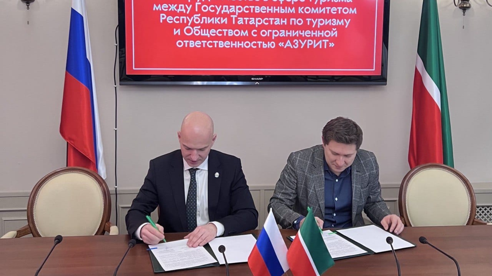 Сегодня в Государственном комитете Республики Татарстан по туризму состоялось подписание соглашения о сотрудничестве в сфере туризма с туристической компанией «АЗУРИТ» - его подписали председатель Госкомитета РТ по туризму Сергей Иванов и директор ООО «АЗУРИТ» Аллен Гаврилов.